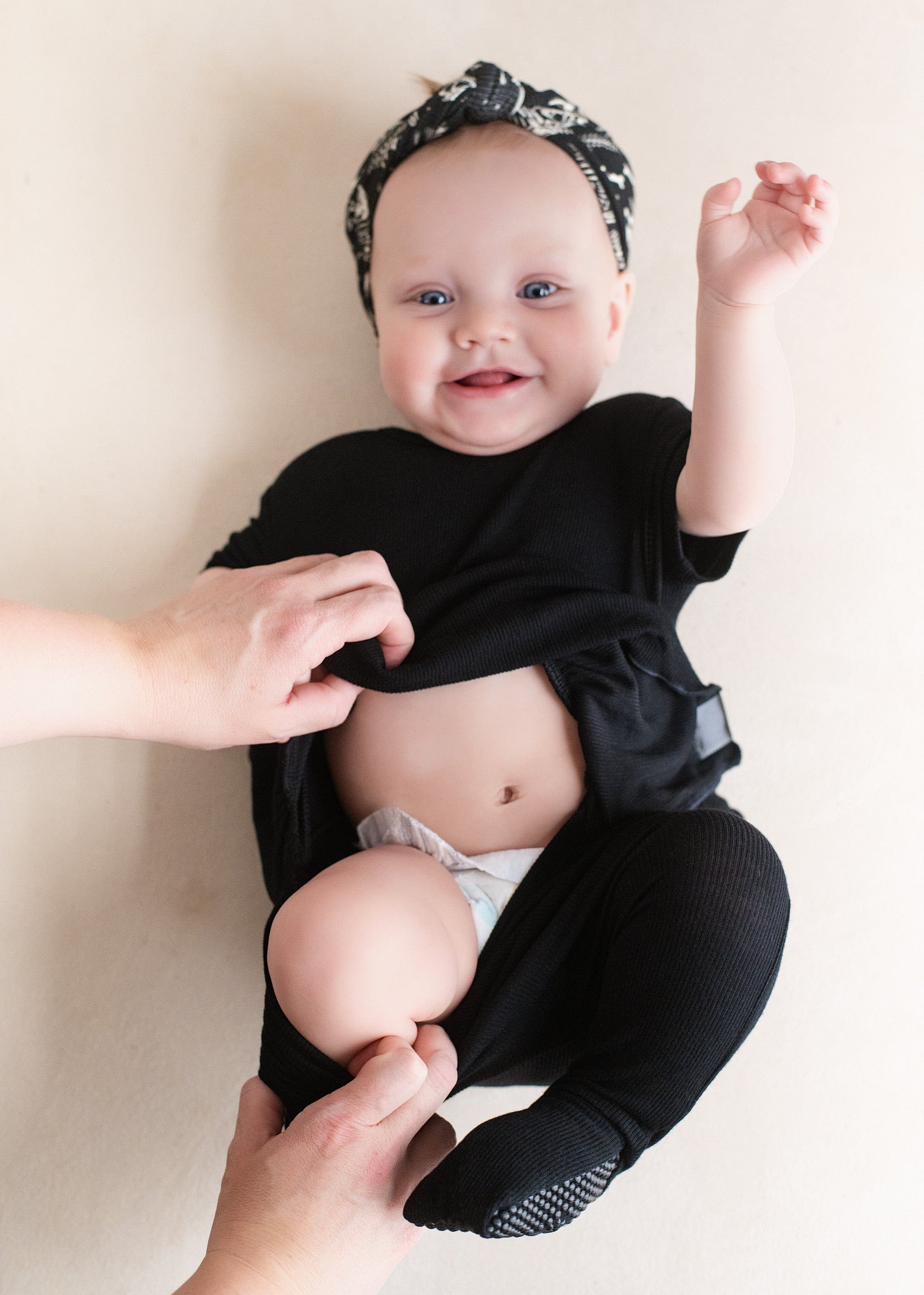 We were sleep-deprived and tired of mis-snapping our baby’s onesies or pinching them with long body length zippers before our first cup of coffee. So we changed the design game. Say hello to the first snap-free, zipper-free romper of its kind to open with an ultra-stretchy, patented envelope design.